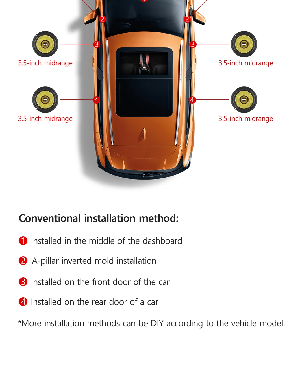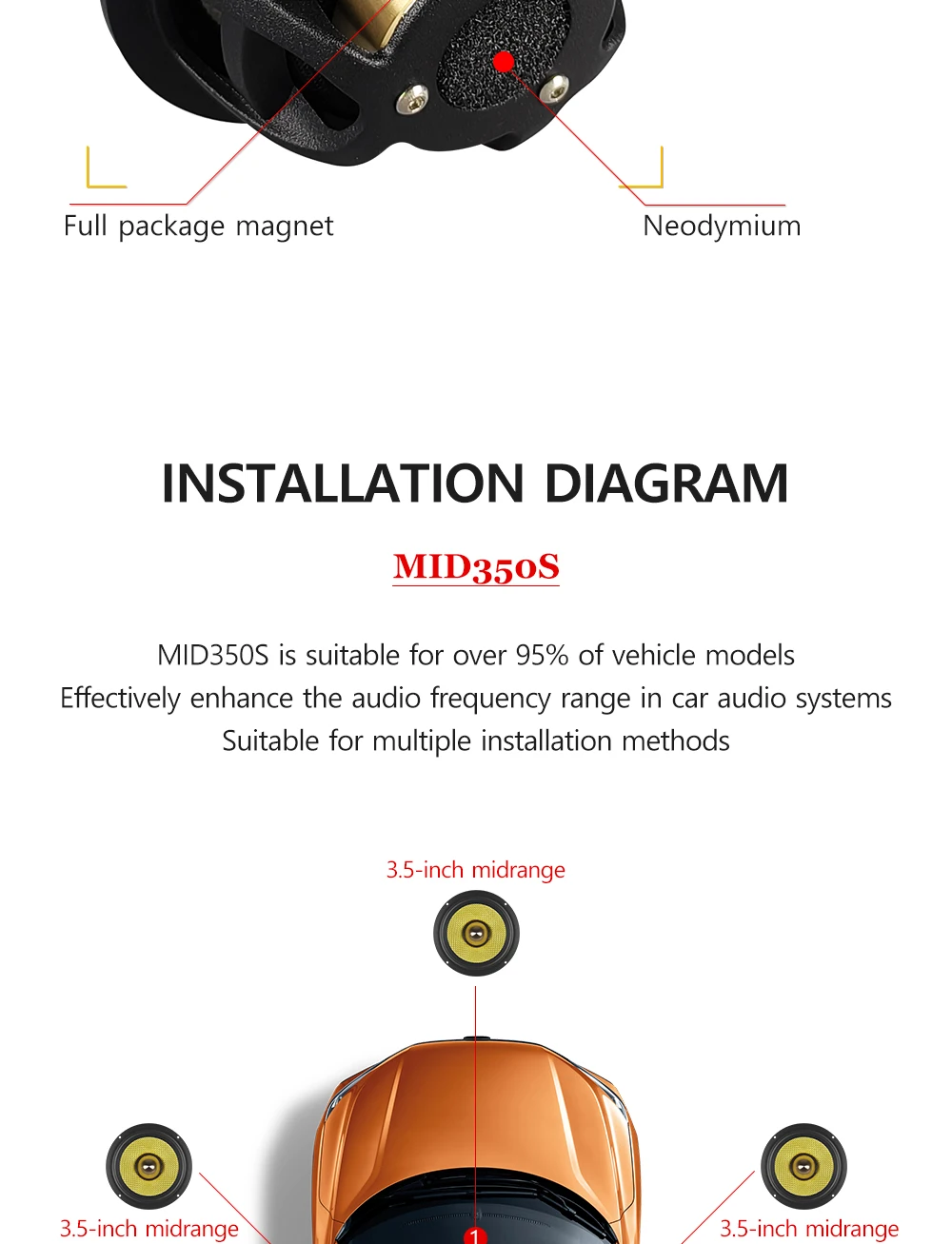 MID350S is a car audio mid frequency system designed specifically for 3-channel frequencies. It can provide impressive mid-range, deep recovery mid-range audio, and ultimate vocal performance in almost any car audio system.