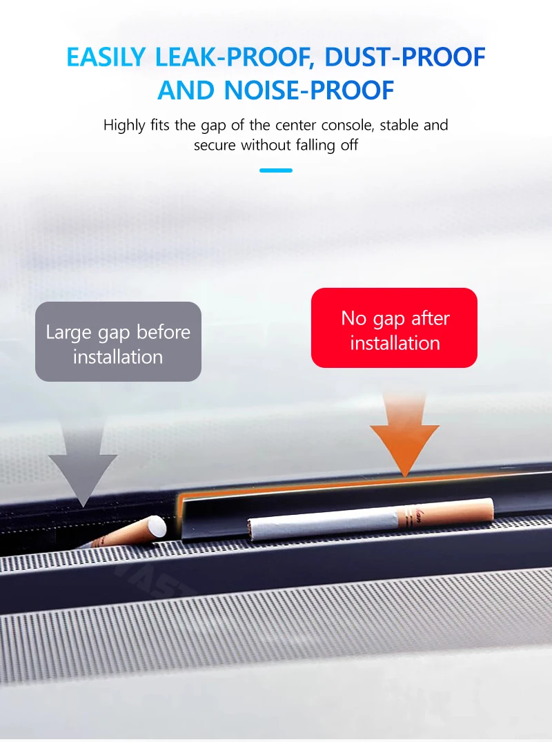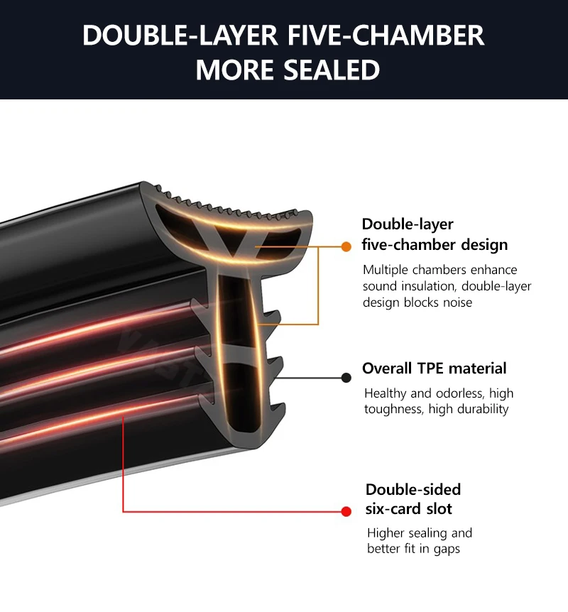 1. Premium TPE Material for Durability Crafted from safe, non-toxic TPE polymer material, this central control sealing strip boasts strong toughness and tear resistance. It maintains good flexibility after stretching, resists aging, and won’t fade, ensuring long-lasting performance for your BYD vehicle. 2. 98% Sound Insulation for Quiet Driving Engineered with a double-layer five-chamber design, it effectively blocks 98% of noise, creating a serene driving environment. Say goodbye to loud road noises and enjoy a peaceful ride, whether in city traffic or on highways. 3. Extreme High & Low Temperature Resistance Withstands extreme temperatures ranging from -50°C to 260°C. Whether facing freezing winters or scorching summers, its high durability ensures consistent performance without deformation, making it suitable for all weather conditions. 4. Non-Destructive & Hassle-Free Installation Designed for a perfect fit on BYD models, it fills the gap between the center console and front windshield without sticking. Simply snap it in-no tools, no damage to your car, and no interference with original vehicle functions. 5. Multifunctional Sealing Protection Effectively prevents dust, debris, and liquids from entering the gap. Its double-sided six-card slot design ensures a tight fit, offering leak-proof, dust-proof, and noise-proof protection, while keeping small items from falling into gaps.
